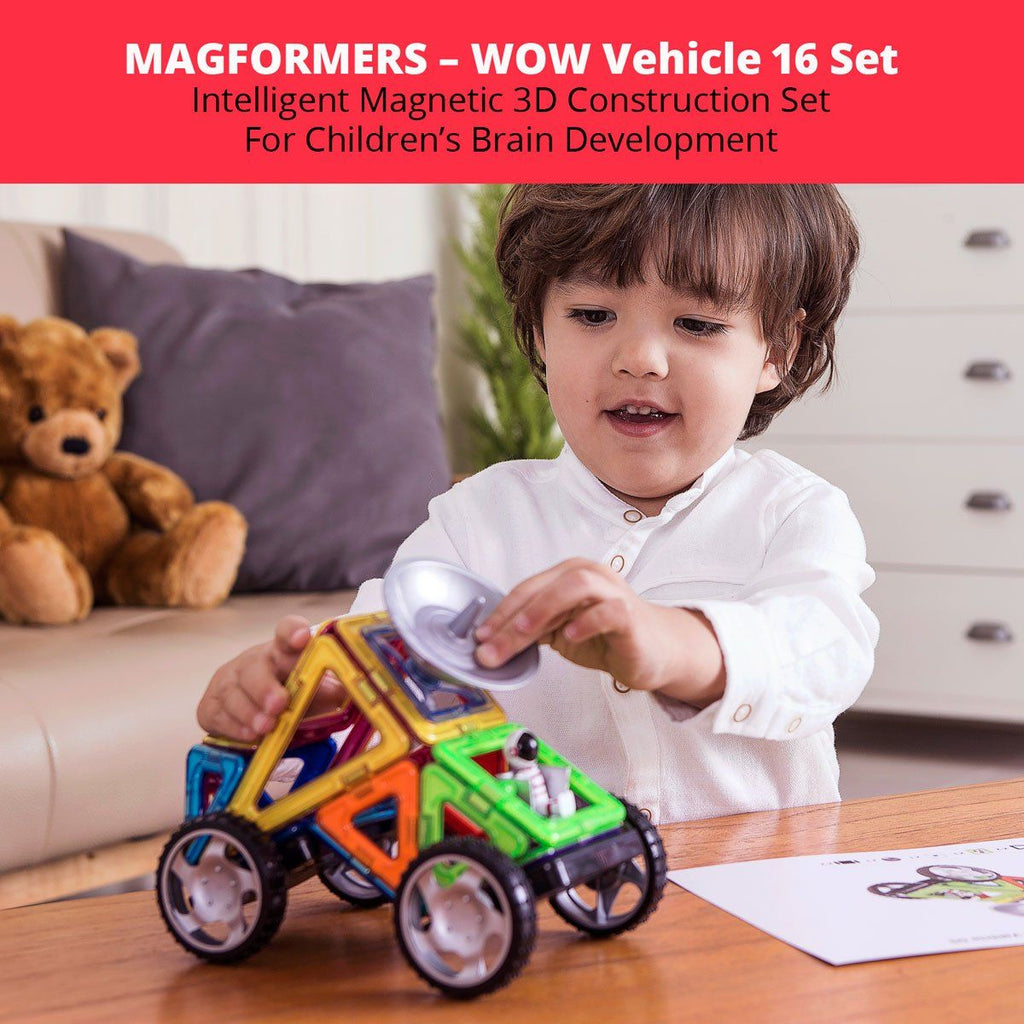• Includes 39 colourful and educational double-sided activity cards – 11 key recognition cards for making shapes, 8 cards for imitating the planar figures and 20 inspiring cards for making stylish Magformers mini-cars. Magformers WOW 16 Set challenges the minds of young children inspiring their limitless imagination and creativity, reinforces problem solving skills and stimulating brain developments. Suitable for all children big and small, age 3 – 93 years