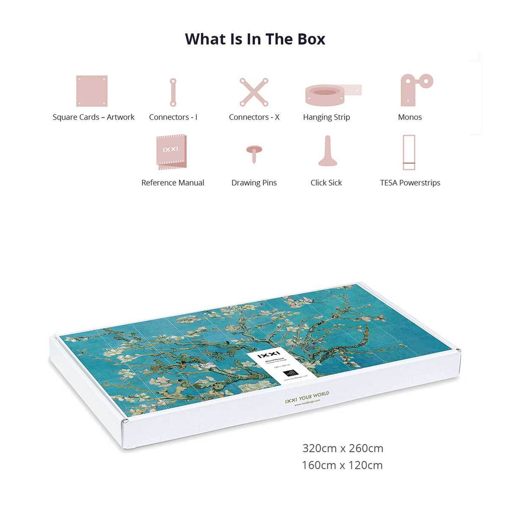 IXXI Innovative Dutch-Designed System – A stylish and innovative way to display beautiful wall art decoration in any shape, size and style you want in your home. Comes packed in a beautiful compact package with individual Square Cards (Size: 20cm), ABS Plastic Connectors, Manual and assembly tools