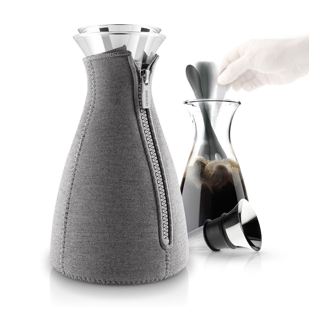 Drip-free coffee brewing flask with woven textile cover and stirrer.