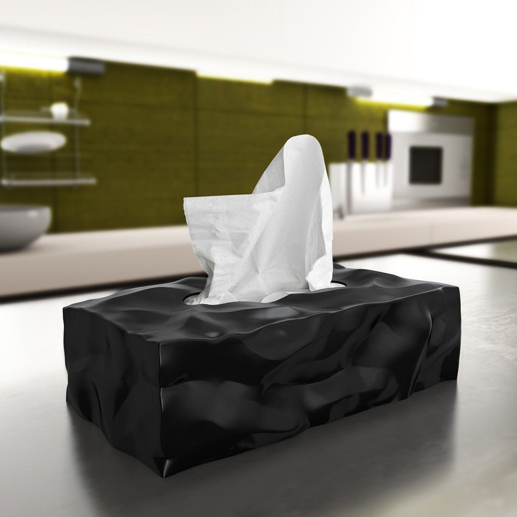 A tissue box cover with a crumpled surface. Thermoplastic.